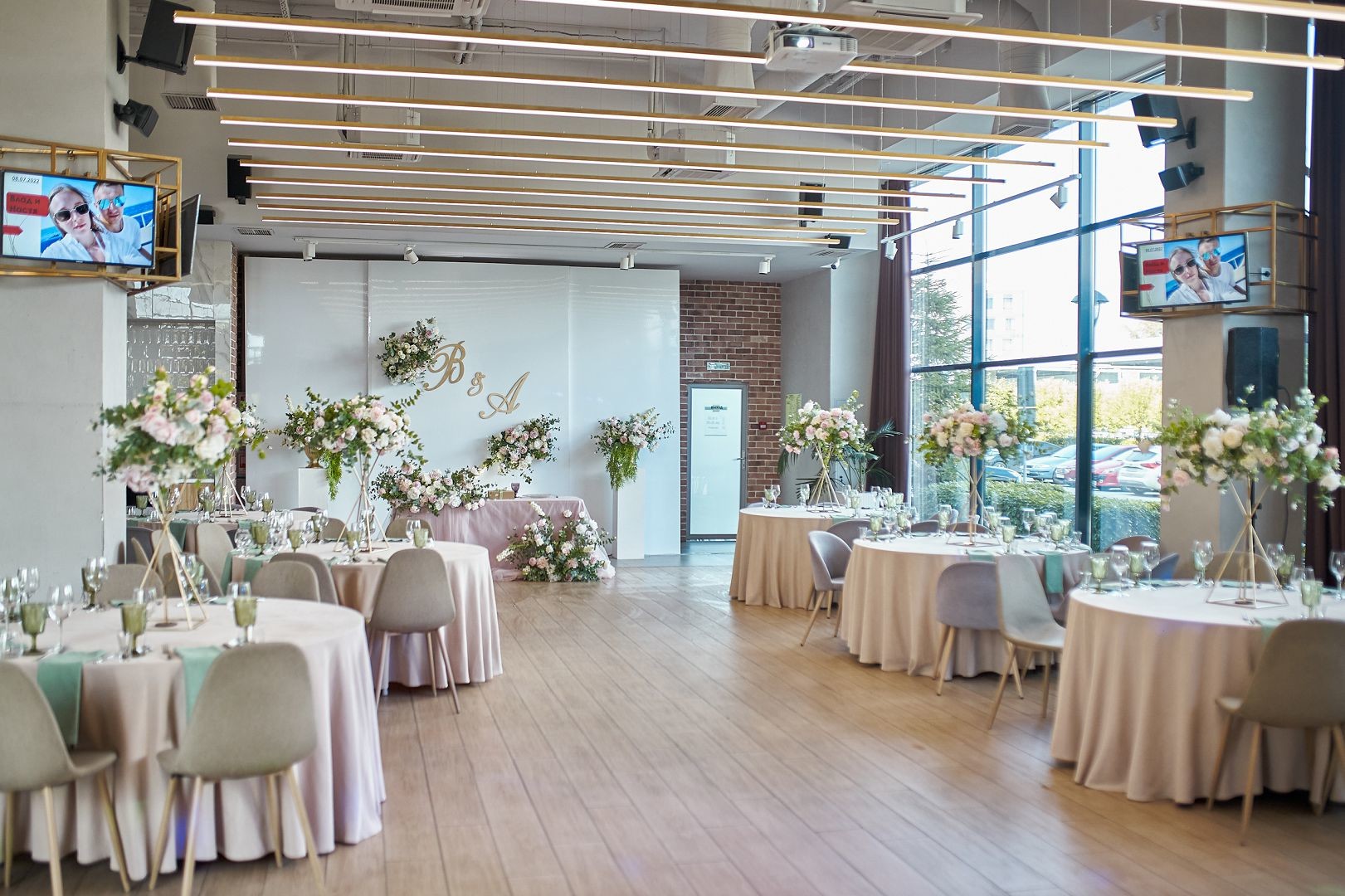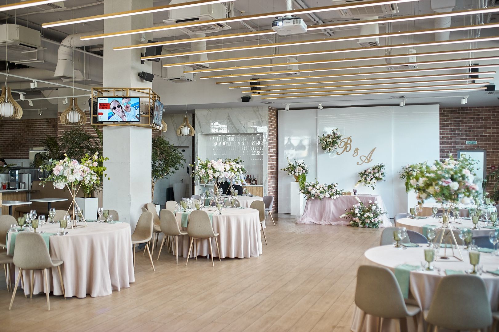 В кафе есть два зала с высокими потолками величиной 300 кв.м и 100 кв.м. Залы кафе имеют хороший обзор, гости увидят сцену и стол молодоженов, даже если на свадьбе 100 человек.